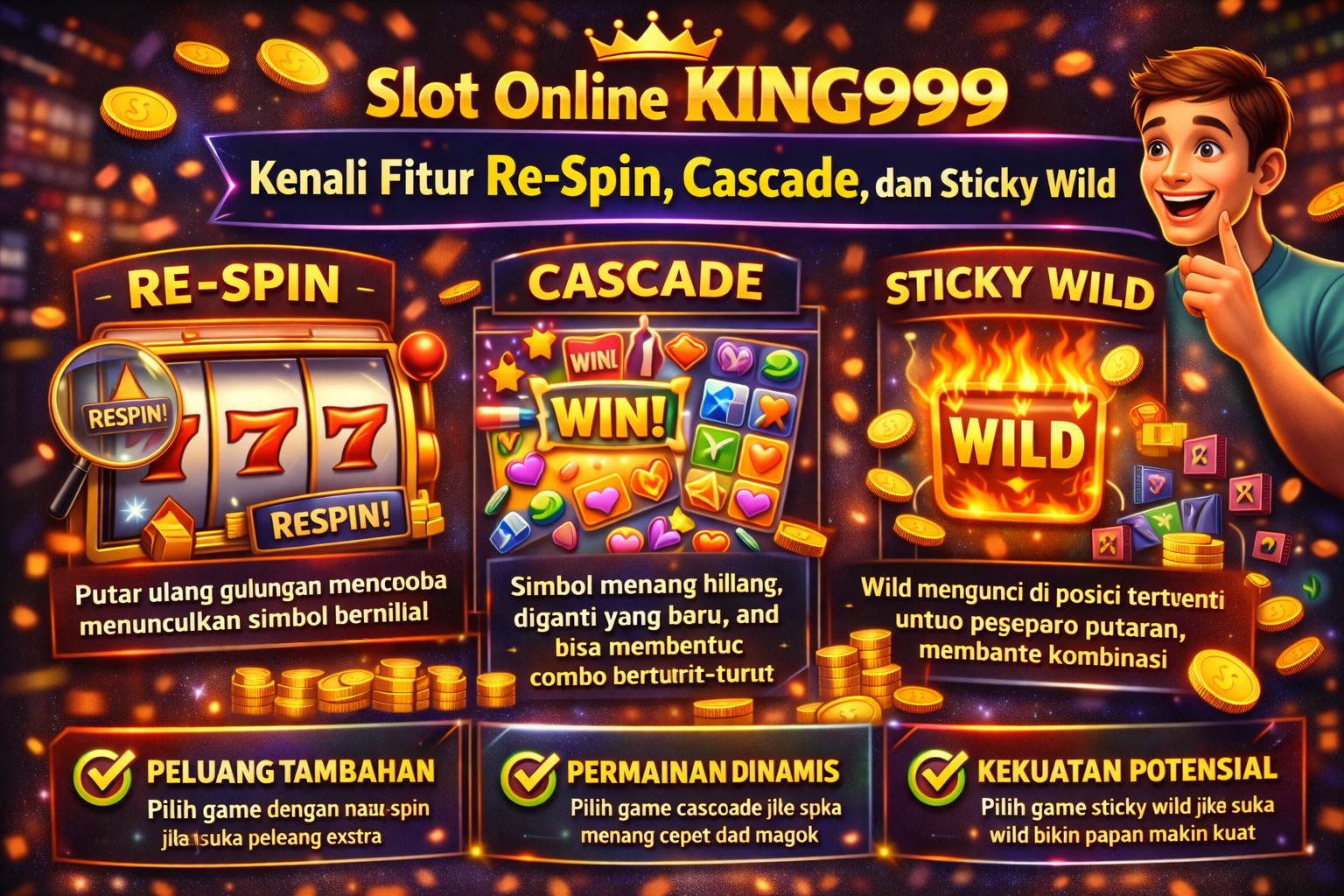 Re-spin, cascade, dan sticky wild adalah tiga fitur yang membuat slot online terasa lebih modern dan bervariasi. Di KING999, memahami cara kerja ketiganya membantumu memilih game yang sesuai selera: apakah kamu suka peluang tambahan, kombo berantai, atau wild yang mengunci dan membangun momentum.